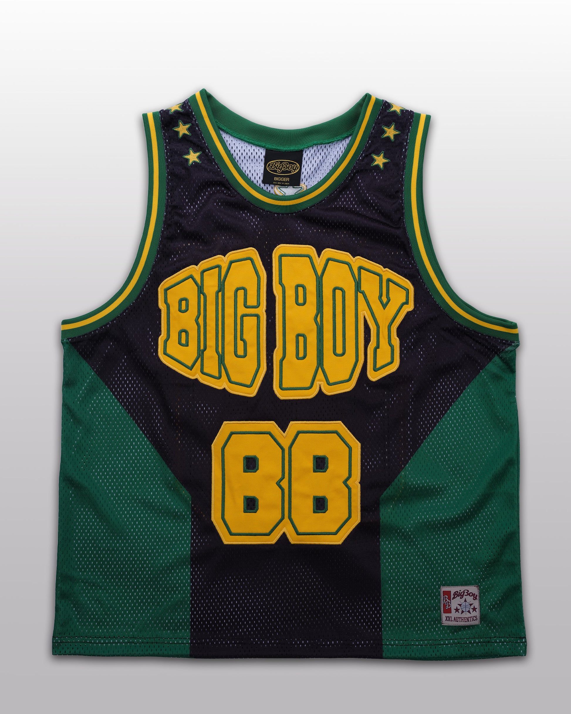 Branding: Embroidered interior neck labels, Big Boy “XXL Authentics” hem patch, and contrast neck lining.