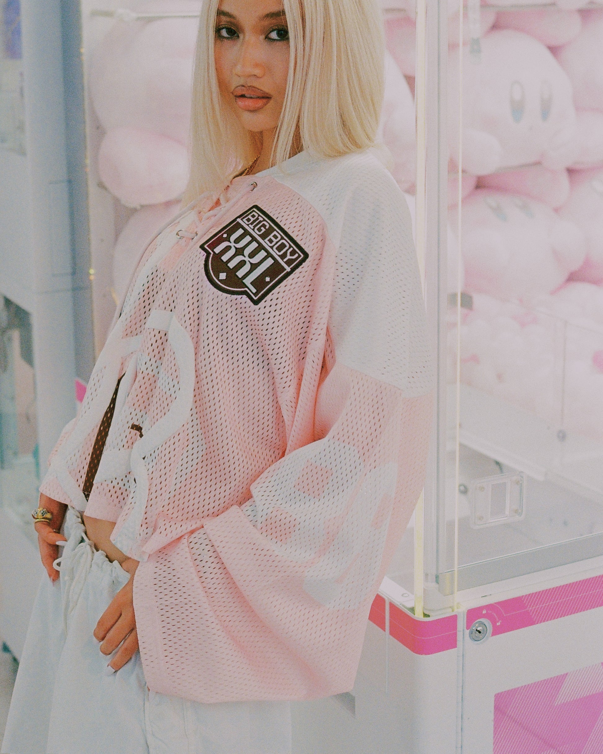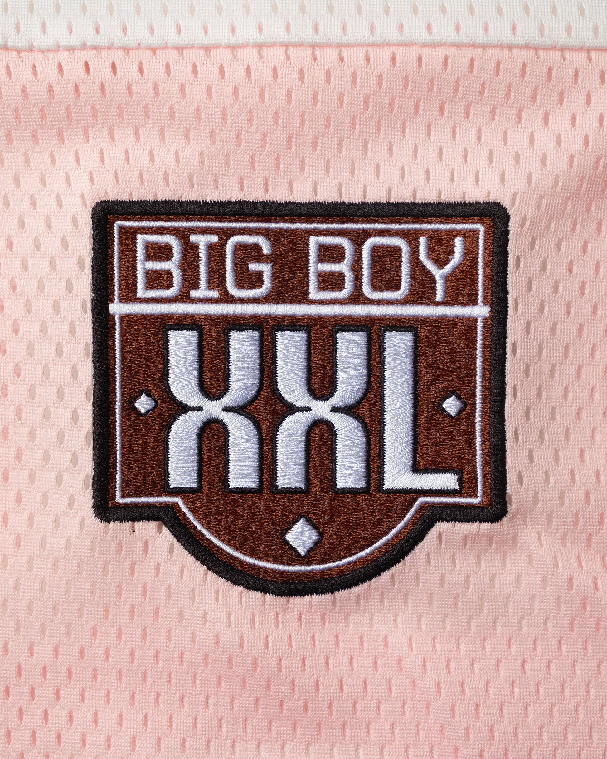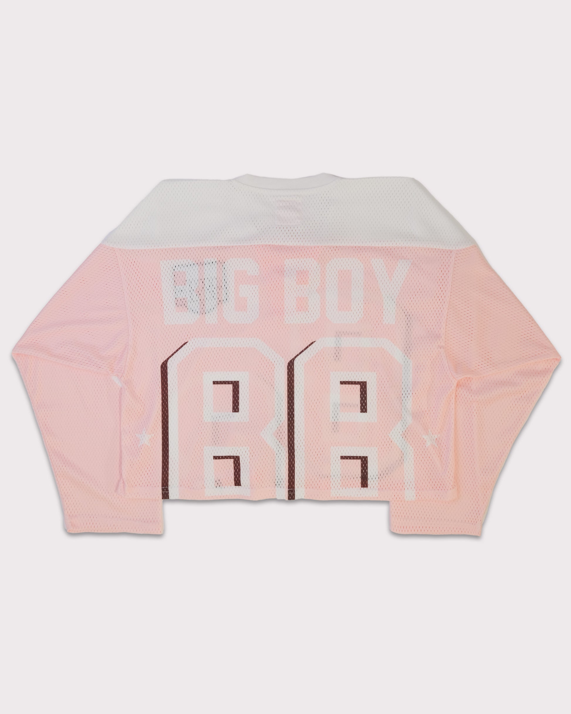 Cropped fitting hockey jersey, crafted from high-quality mesh, jerseys feature "BB" branding puff print on the front and screen print on the back. Including draw strings on the collar with an "XXL" badge embroidery on left chest.
